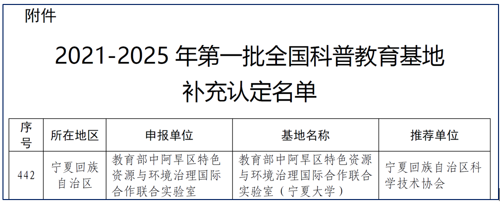 近日,中国科学技术协会办公厅公布《2021-2025年度第一批全国科普教育基地补充认定名单》,我校“教育部中阿旱区特色资源与环境治理国际合作联合实验室”入选首批全国科普教育基地。