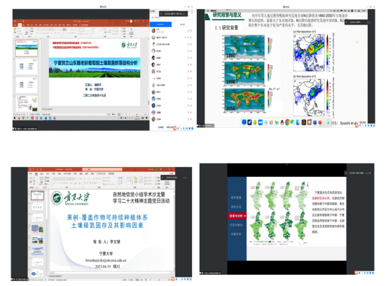 本次学术沙龙共分为三部分。第一部分是“研友相伴”,由各位汇报人对各自的论文或研究进行分享交流。人文与旅游方向党小组的刘亚楠、翟嘉港、郑键津和牛家禾党员同志结合自己的研究方向,分别分享了《浙江省主要景区旅游适宜性评价》《黄河“几”字弯地区城市网络联系的时空动态及驱动机制》《铺境文化中信俗类非物质文化遗产存续路径研究——以泉州为例》《银川市都市圈“三生空间”耦合协调高质量发展研究》4个主题报告。自然地信党小组的佘洁、李春环、潘新宇、杨航、李文慧、李红霞六位党员同志分别根据自己的研究方向和研究成果结合二十大精神做了题为《基于面向对象技术的荒漠草原无人机遥感植被分类》《酸沉降下荒漠矿区植物多样性及其影响因素》《宁夏贺兰山东麓老龄葡萄园土壤真菌多样性研究》《黄河上游生态脆弱区复合生态系统韧性时空分异——以宁夏为例》《果树-覆盖作物可持续种植体系土壤碳氮固存及其影响因素》和《地貌分类前沿》6个主题报告。