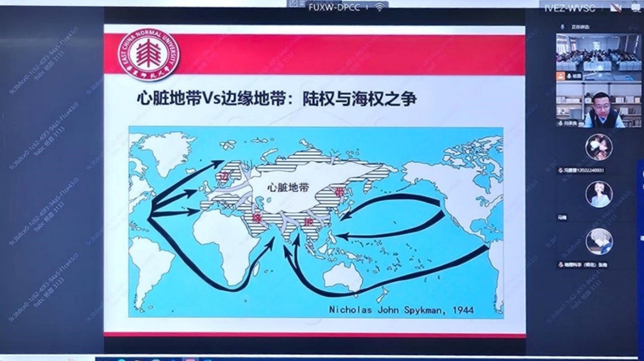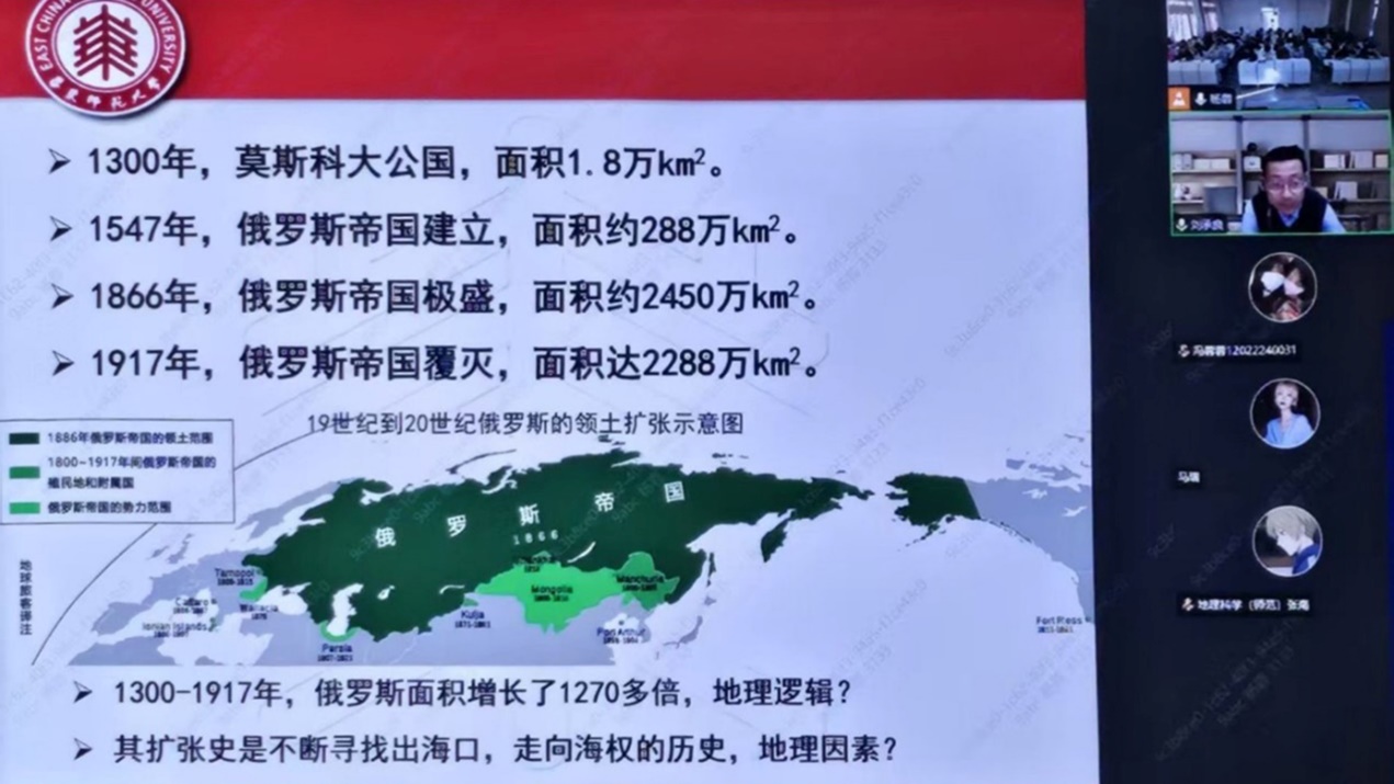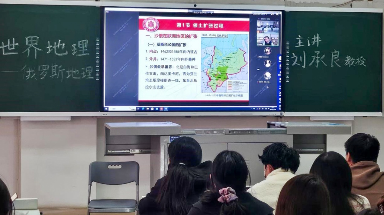 刘承良在上海华东师大校区通过云端与任课教师杨蓉在线下教室一同为2022级地理科学(师范)专业和2023级地理科学专业的同学们分享“世界地理之俄罗斯国家地理”章节内容。