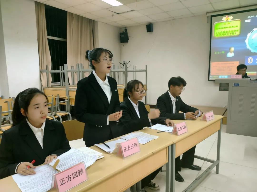 比赛共分两场,首场阵容为2020级地理科学类2班对2020级地理科学(教师教育)班,辩题为“大众舆论对司法审判是否利大于弊”。比赛中,双方一辩分别对己方论点进行简短陈词,阐述看法。而在接下来的对辩环节中,双方二三辩针对对方逻辑漏洞提辩驳斥,并强化自己论述的合理性,现场气氛热烈。最后,2020级地理科学(教师教育)获得胜利。