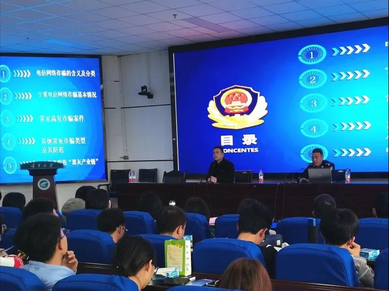 在讲座中,主讲人从电信网络诈骗的含义和分类、宁夏电信网络诈骗基本情况、常见高发诈骗案件、其他常见诈骗类型及其防范、电信诈骗的“黑灰产业链”五个方面展开讲解。此次讲座目的是让同学们注意防范公民个人信息安全,预防被害人因经不住他人虚构的利益诱惑,从而产生财产损失,告诫同学们严密保管个人信息及证件,若贷款需通过正规手续合法途径到银行办理。大学生应树立正确的消费观,注意网络消费安全,保护好个人财产。网络具有虚幻性,网络交友要谨慎,不义之财不可得,切莫小便宜吃大亏。若发生网络诈骗事件,不要慌张,要马上核实真实情况并选择报警。对此杨警长强调,最简单有效的办法就是:置之不理。