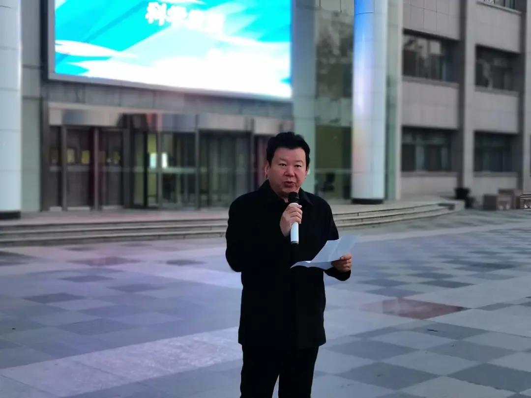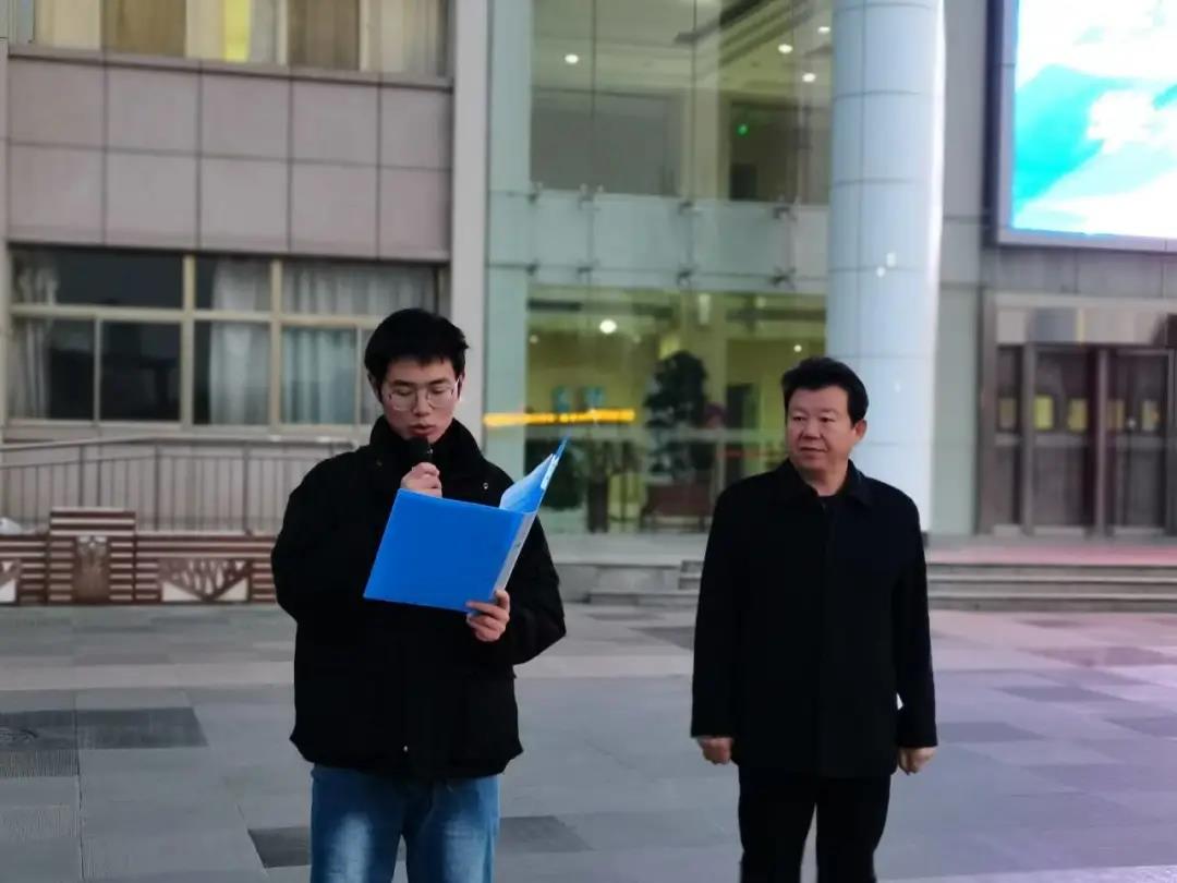 迎着朝阳,升旗手们护卫着鲜艳的五星红旗入场,他们着装整齐、步伐矫健。随后,《义勇军进行曲》响起,大家集体行注目礼,齐声低唱国歌,现场气氛庄严肃穆。伴随着主持人的简洁开场,学生代表王帅同学进行发言。作为学生代表,他从当代青年大学生的角度出发,诠释疫情之下当代大学生肩负的责任,以及对党和国家的敬佩之情,给在场同学留下了深刻印象。